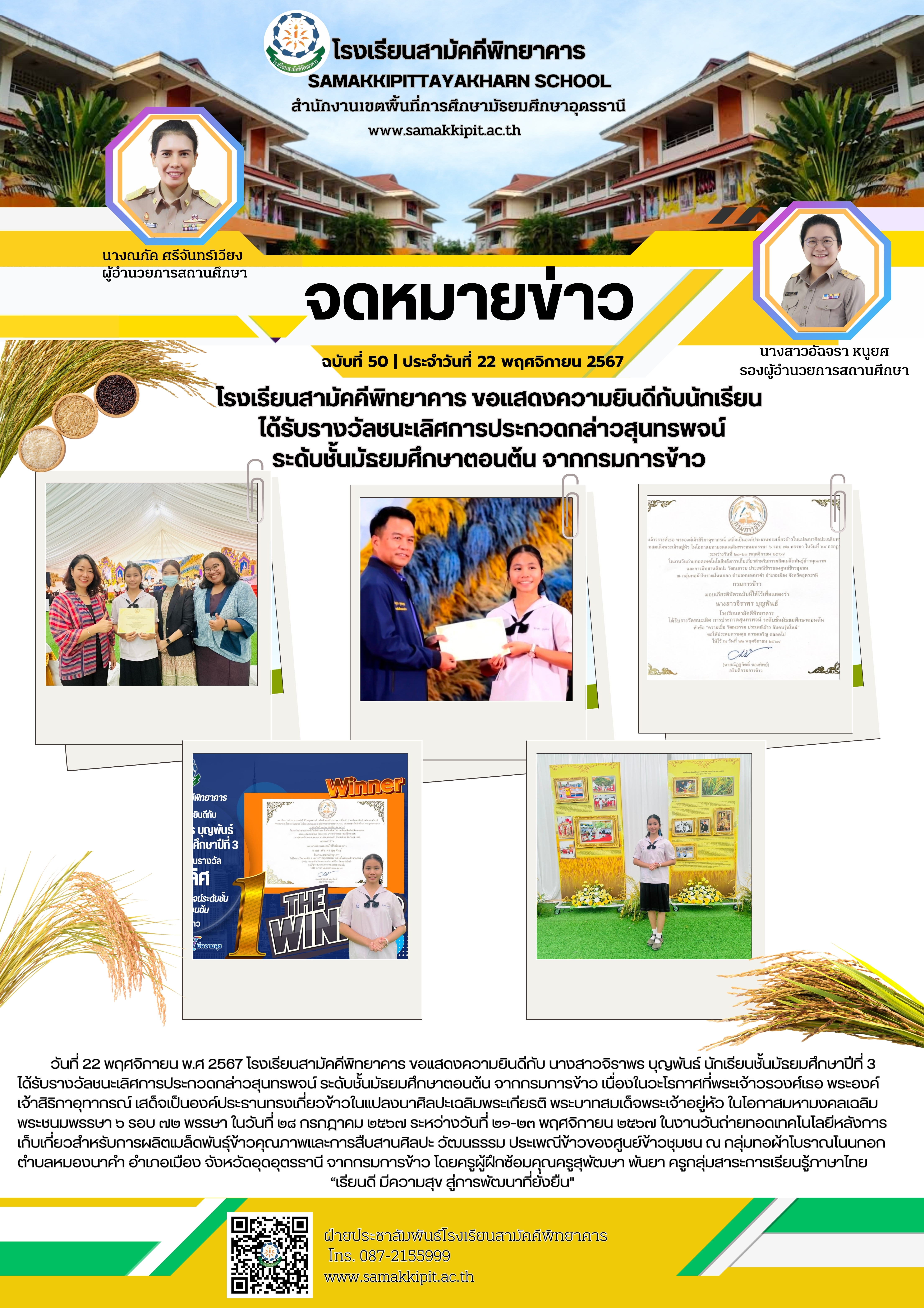 วันที่ 22 พฤศจิกายน พ.ศ 2567 โรงเรียนสามัคคีพิทยาคาร ขอแสดงความยินดีกับ นางสาวจิราพร บุญพันธ์ นักเรียนชั้นมัธยมศึกษาปีที่ 3 ได้รับรางวัลชนะเลิศการประกวดกล่าวสุนทรพจน์ ระดับชั้นมัธยมศึกษาตอนต้น จากกรม