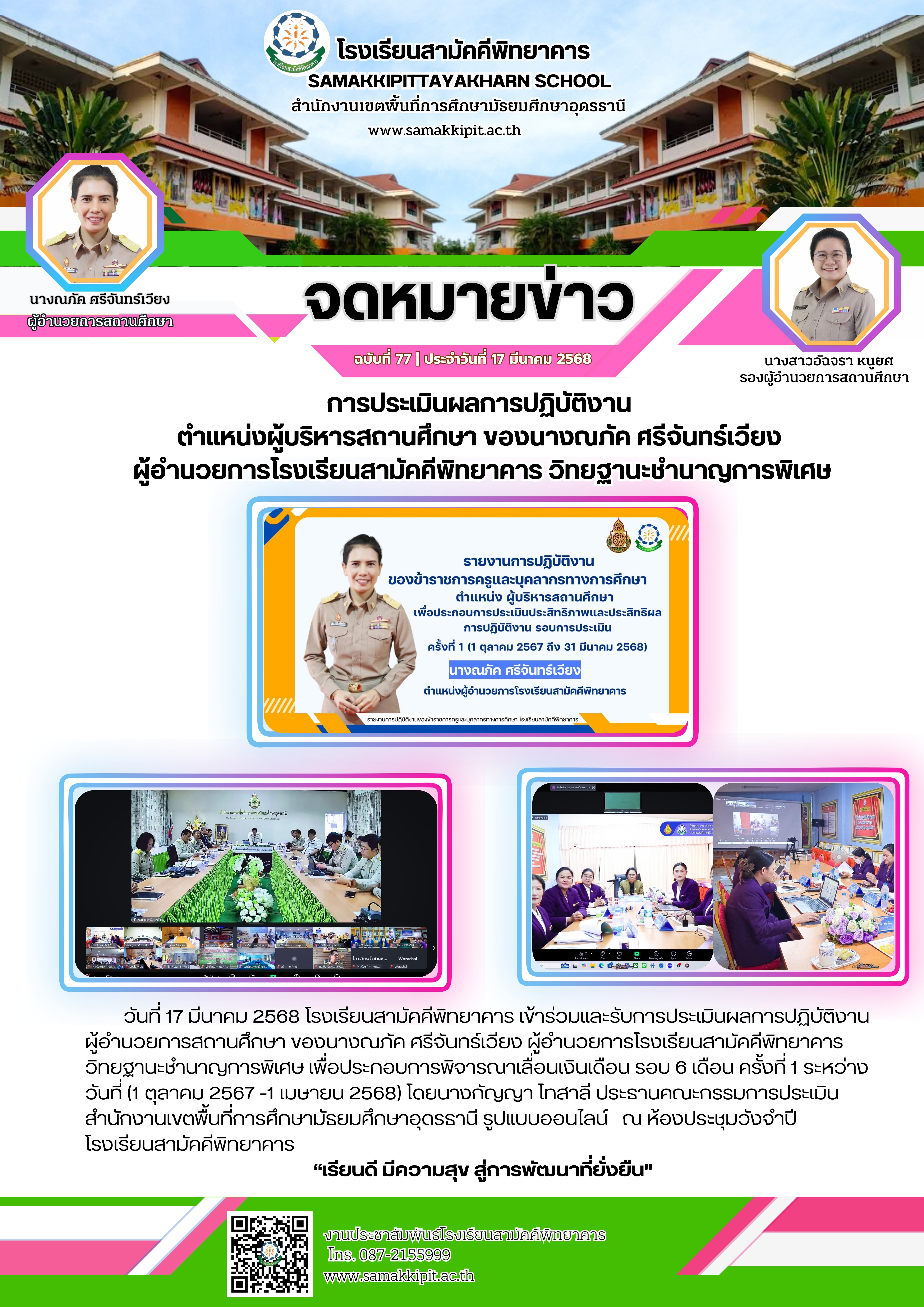 วันที่ 17 มีนาคม 2568 การประเมินผลการปฏิบัติงาน ตำแหน่งผู้บริหารสถานศึกษา ของนางณภัค ศรีจันทร์เวียง ผู้อำนวยการโรงเรียนสามัคคีพิทยาคาร วิทยฐานะชำนาญการพิเศษ