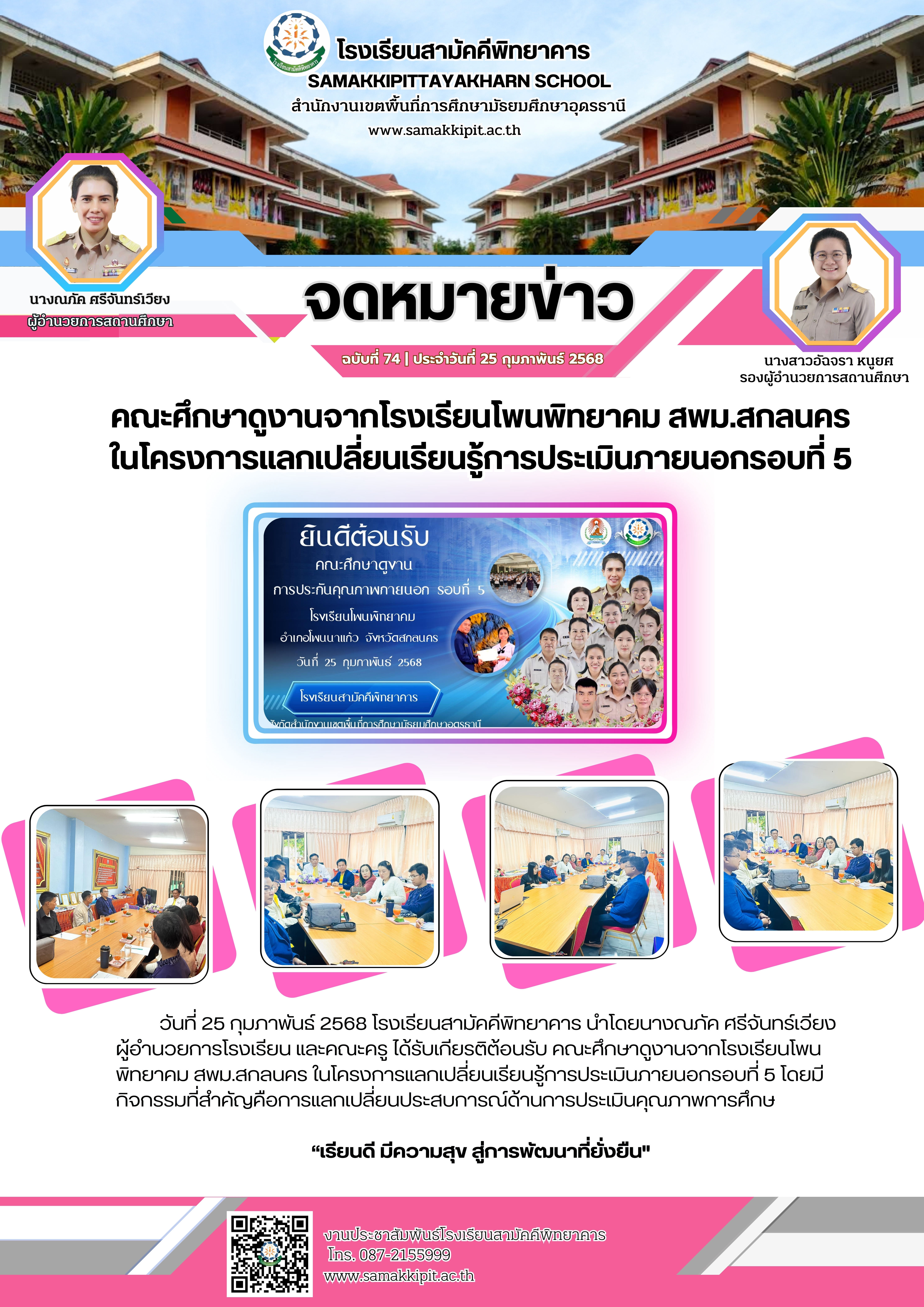 วันที่ 25 กุมภาพันธ์ 2568 โรงเรียนสามัคคีพิทยาคาร นำโดยนางณภัค ศรีจันทร์เวียง ผู้อำนวยการโรงเรียน และคณะครู ได้รับเกียรติต้อนรับ คณะศึกษาดูงานจากโรงเรียนโพนพิทยาคม สพม.สกลนคร ในโครงการแลกเปลี่ยนเรียนรู้การประเมินภายนอกรอบที่ 5 โดยมีกิจกรรมที่สำคัญคือการแลกเปลี่ยนประสบการณ์ด้านการประเมินคุณภาพการศึกษ “เรียนดี มีความสุข สู่การพัฒนาที่ยั่งยืน"