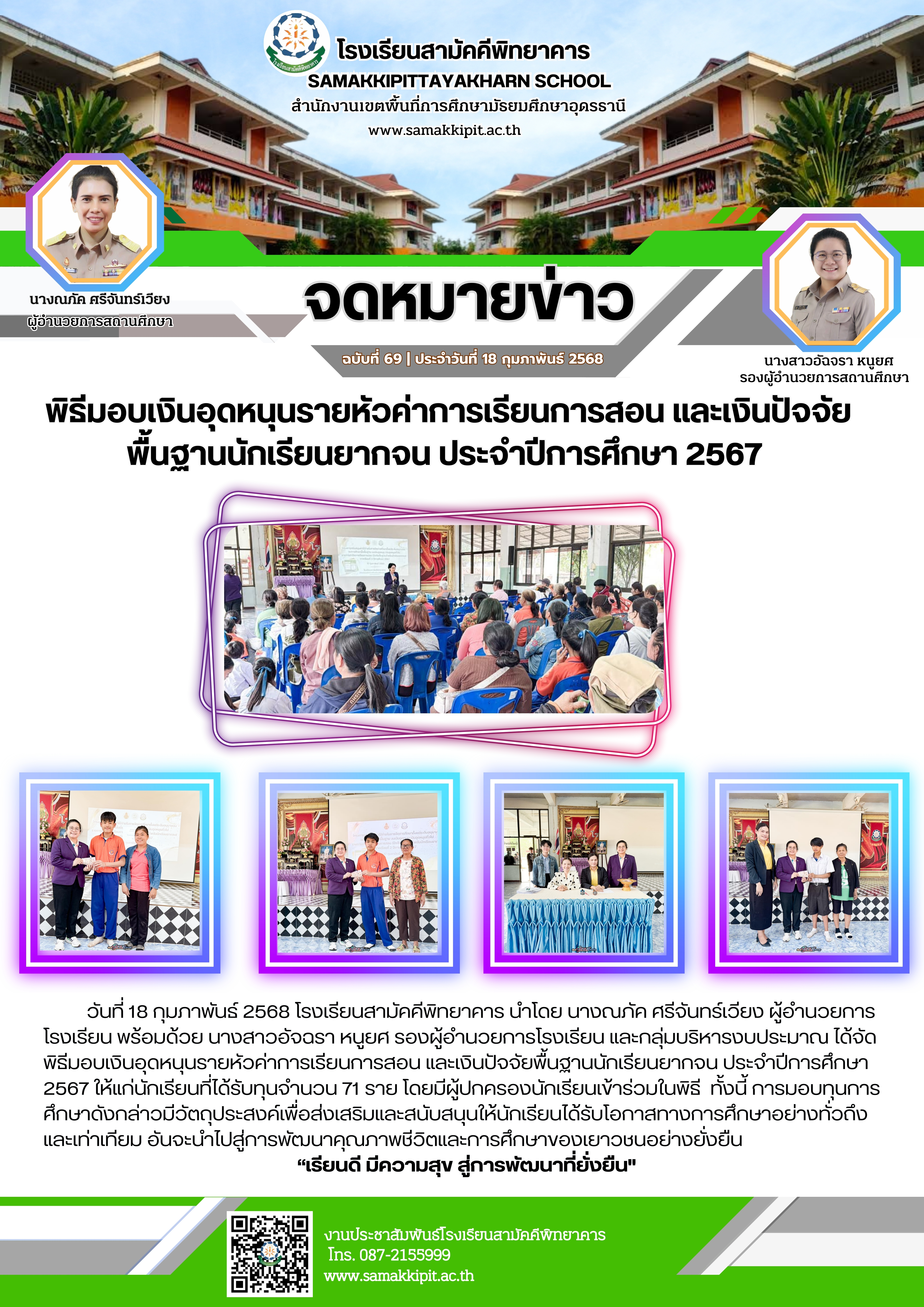 วันที่ 18 กุมภาพันธ์ 2568 โรงเรียนสามัคคีพิทยาคาร นำโดย นางณภัค ศรีจันทร์เวียง ผู้อำนวยการโรงเรียน พร้อมด้วย นางสาวอัจฉรา หนูยศ รองผู้อำนวยการโรงเรียน และกลุ่มบริหารงบประมาณ ได้จัดพิธีมอบเงินอุดหนุนรายหัวค่าการเรียนการสอน และเงินปัจจัยพื้นฐานนักเรียนยากจน ประจำปีการศึกษา 2567 ให้แก่นักเรียนที่ได้รับทุนจำนวน 71 ราย โดยมีผู้ปกครองนักเรียนเข้าร่วมในพิธี ทั้งนี้ การมอบทุนการศึกษาดังกล่าวมีวัตถุประสงค์เพื่อส่งเสริมและสนับสนุนให้นักเรียนได้รับโอกาสทางการศึกษาอย่างทั่วถึงและเท่าเทียม อันจะนำไปสู่การพัฒนาคุณภาพชีวิตและการศึกษาของเยาวชนอย่างยั่งยืน
