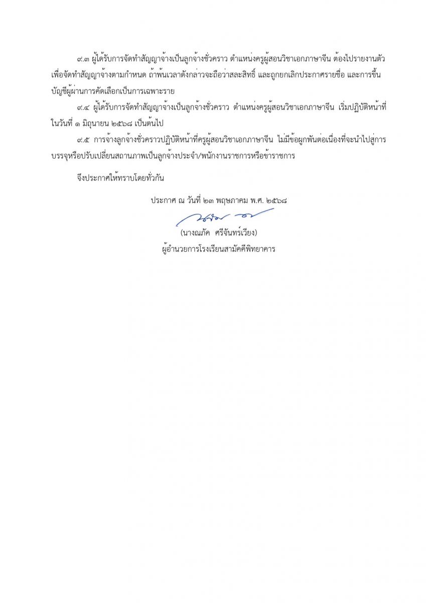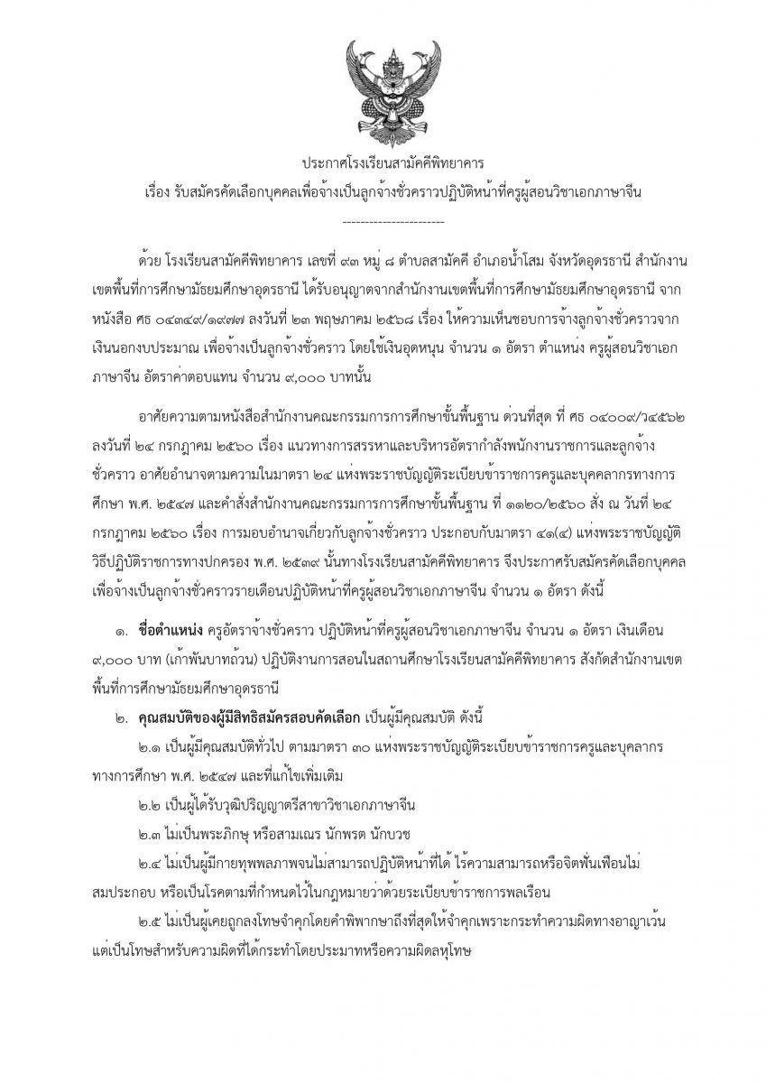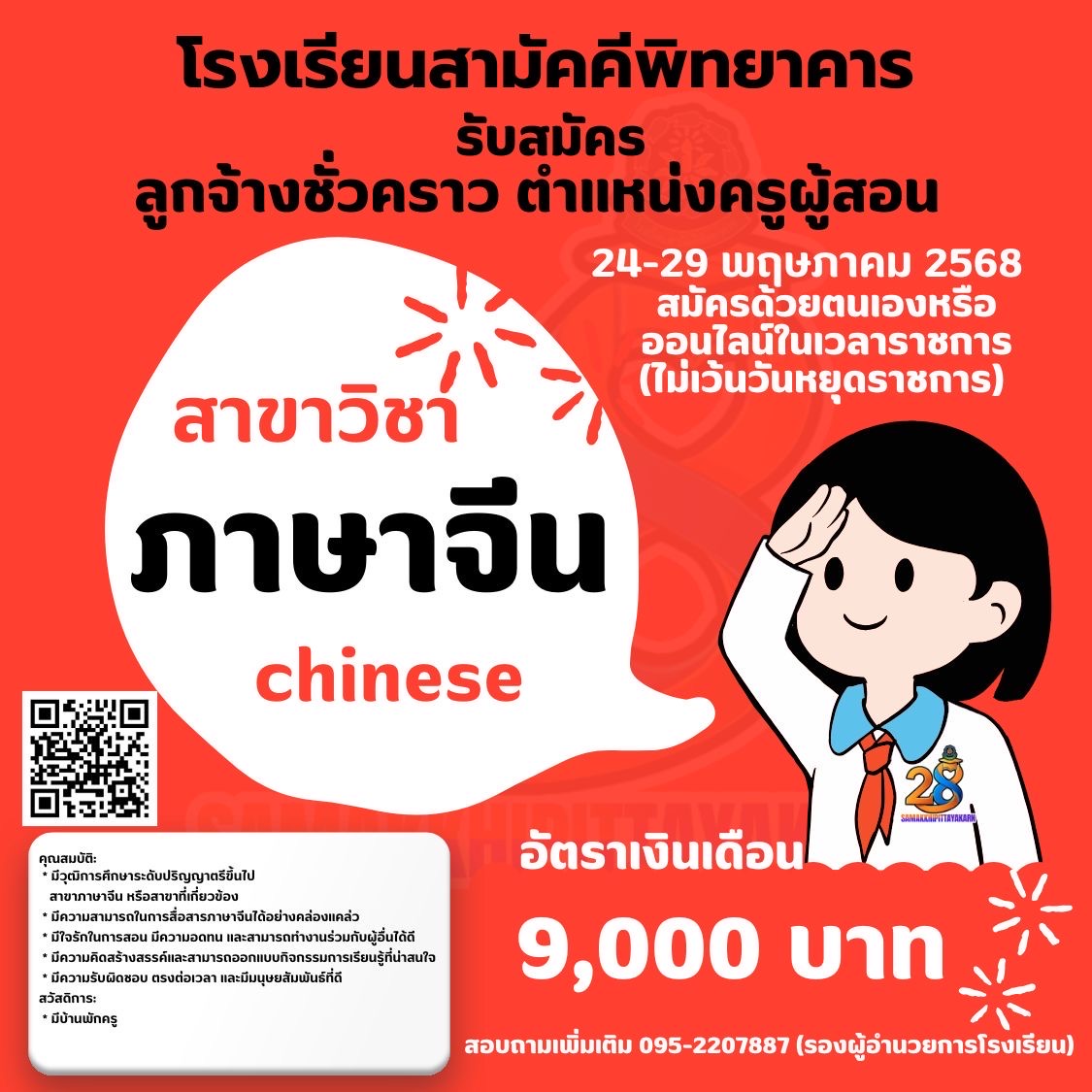 ประกาศ รับสมัครคัดเลือกบุคคลเพื่อจ้างเป็นลูกจ้างชั่วคราวปฏิบัติหน้าที่ครูผู้สอนวิชาเอกภาษาจีน