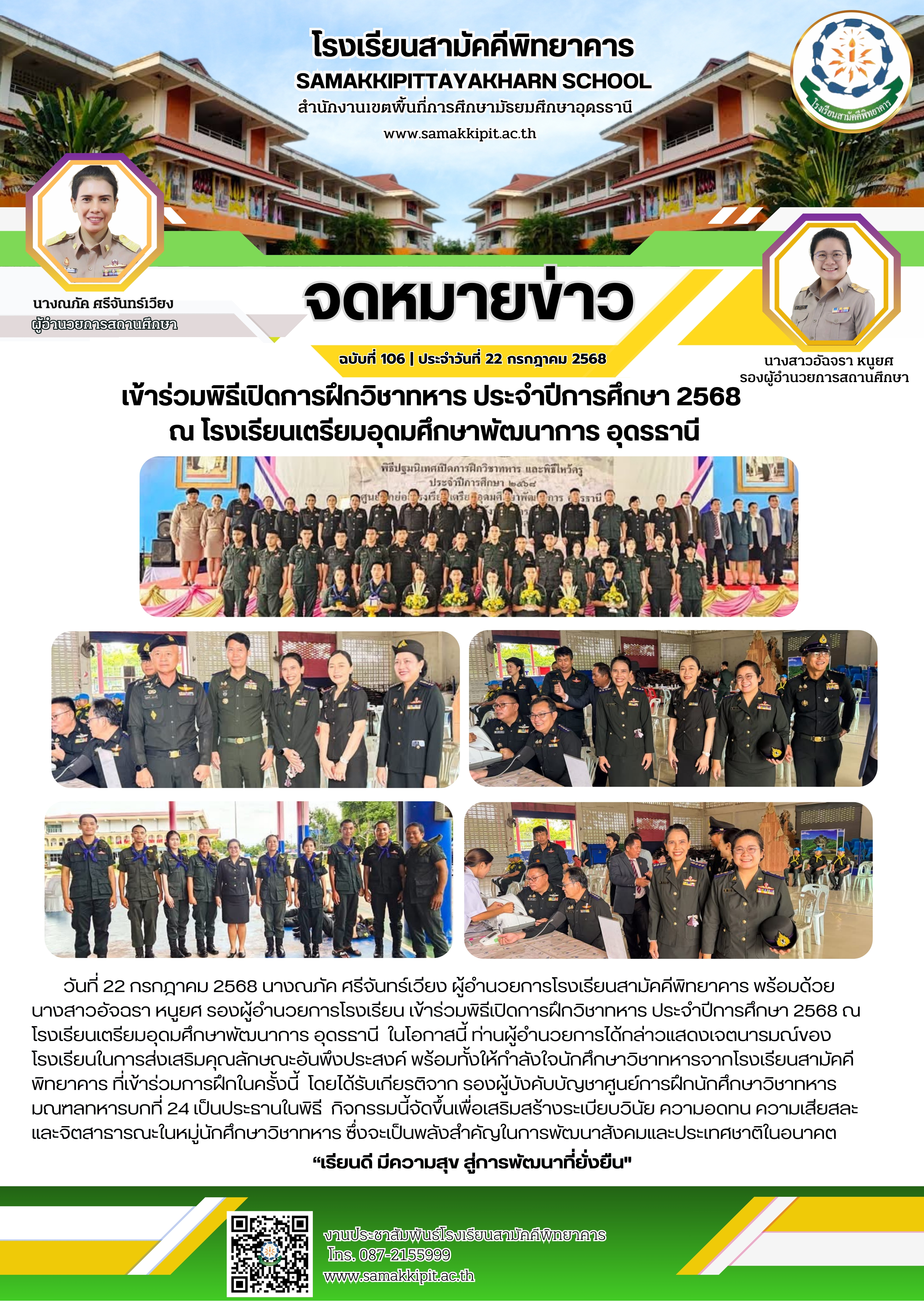 นางณภัค ศรีจันทร์เวียง ผู้อำนวยการโรงเรียนสามัคคีพิทยาคาร พร้อมด้วย นางสาวอัจฉรา หนูยศ รองผู้อำนวยการโรงเรียน เข้าร่วมพิธีเปิดการฝึกวิชาทหาร ประจำปีการศึกษา 2568 ณ โรงเรียนเตรียมอุดมศึกษาพัฒนาการ อุดรธานี