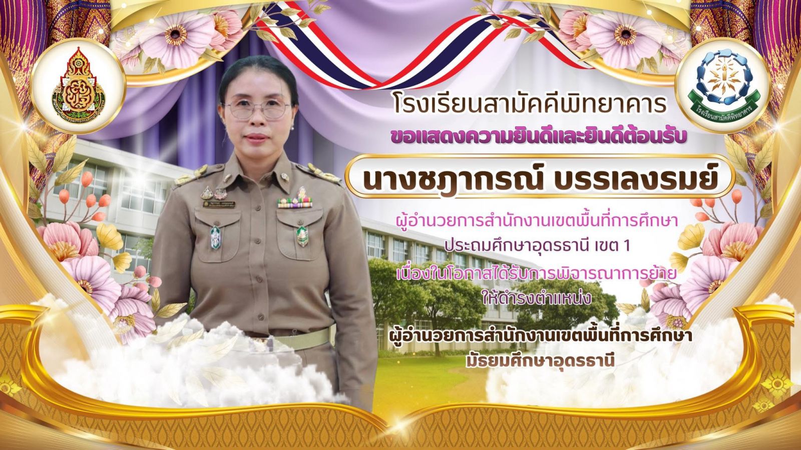 โรงเรียนสามัคคีพิทยาคาร ขอแสดงความยินดีและยินดีต้อนรับ นางชฎากรณ์ บรรเลงรมย์ เนื่องในโอกาสได้รับการพิจารณาย้ายให้ดำรงตำแหน่ง ผู้อำนวยการสำนักงานเขตพื้นที่การศึกษามัธยมศึกษาอุดรธานี นับเป็นเกียรต